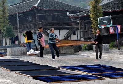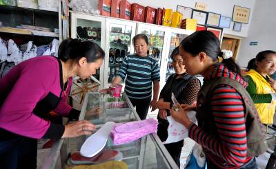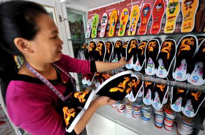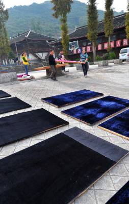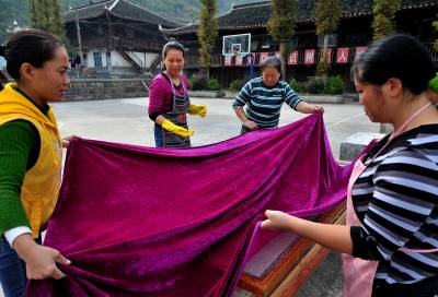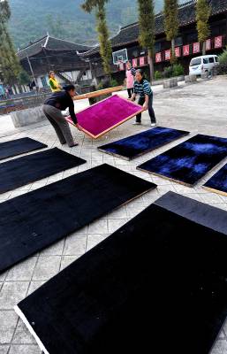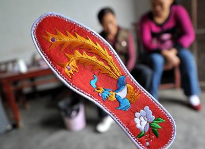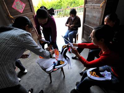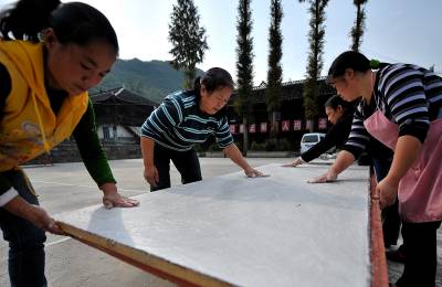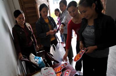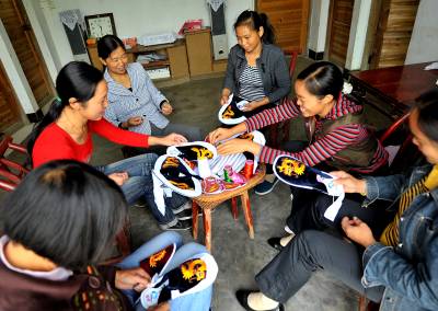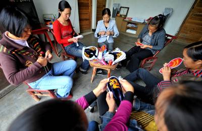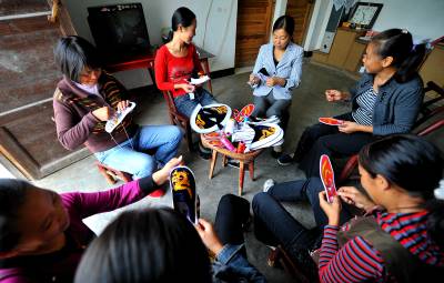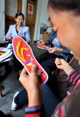 10月9日,宣恩县沙道镇,农妇们忙着用浆糊、棉布等制作刺绣的原材料。在该县沙道沟镇,由土家妇女周银菊牵头组成了一支有300余名土(家)苗农妇参与的刺绣队伍,她们利用劳作之余的空闲时间,每年绣出将土家刺绣与”千层底儿”布鞋相结合的绣花布鞋(垫)、棉鞋等1.5万双,产品在国内外市场供不应求。而农妇们因此每月可增收1000元以上。本报视界网宋文摄