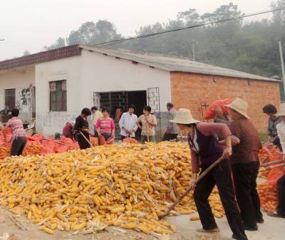 10月9日,在郧县刘洞镇毛坪村公路边的场子里,十几名留守妇女正热火朝天的装包玉米。留守妇女李英娃高兴地说:”这是我们今天掰的玉米,现在要装的全部是我家的!”时下在90%青壮男劳力外出务工的刘洞镇各村,像毛坪村这样的留守妇女互助队成为农忙时节的主力军。(郧县刘洞镇九年一贯制学校高超/摄)