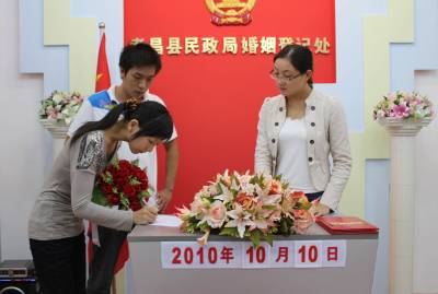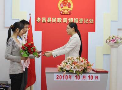 2010年10月10日,不少人认为这个日子蕴含着”十全十美”的美好寓意。当日上午,孝昌有60多对提前预约的准新人,在这一”吉日”扎堆来到该县民政局婚姻登记处,完成结婚登记手续并领取了结婚证。宋俊初摄