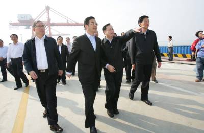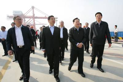 10日,省委书记罗清泉、省长李鸿忠陪同湖南党政代表团考察武汉新港阳逻集装箱二期项目。左2湖南省委书记周强右1湖南省省长徐守盛。(记者柯皓摄)
