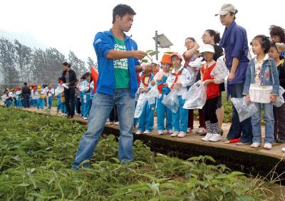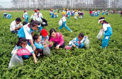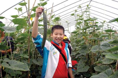 ”开心农场”摘菜忙10日,黄石市广场路英才学校80名”文明小标兵”在老师的带领下,来到大冶市大箕铺镇鑫东生态农业园欣赏品种多样的无公害蔬菜。同时,在农业园农技师的指导下,学生们亲手到蔬菜地里摘青菜、到大棚里摘黄瓜、到玉米地里掰玉米,让这些”文明小标兵”们在伸手采摘蔬菜的过程中享受走进大自然的愉悦和庄稼丰收的乐趣。图一:”文明小标兵”们正在生态农业园蔬菜地里采摘空心菜。图二:农技师在教”文明小标兵”们怎样采摘空心菜。图三:一名”文明小标兵”摘到一条大黄瓜高兴不已。图四:农技师在为”文明小标兵”们介绍蔬菜地里使用的太阳能灭虫灯。黄石市黄石日报摄影部邱孝威摄电话:13807232603邮编:435002