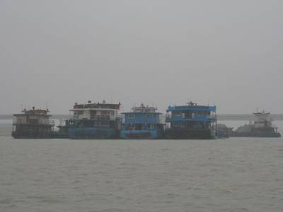 南水北调中线兴隆水利枢纽工程淤塞段航道受阻10月10日拍摄的滞留在南水北调中线兴隆水利枢纽工程段的船舶。当日,南水北调中线兴隆水利枢纽工程导流明渠严重淤塞,来自河南、襄樊、天门、仙桃、潜江等地的20余艘驳船滞留,300吨级以上船舶只能”望江兴叹”。当地海事部门采取紧急疏通航道的办法,解决当前航道问题,预计11日开始疏通航道。(本报视界网刘银斌摄)