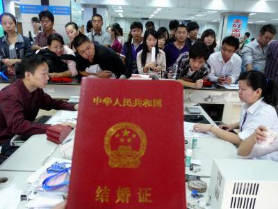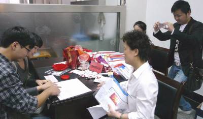 2010年10月10日是个十全十美的好日子、湖北省武汉市江汉区民政局全体干部职工放弃休息,在这个特别的日子里,坚守在工作岗位上,热情周到为当日喜领结婚证的男女青年们服务,通过预约登记和现场办公,使300对伉俪喜领结婚证划上圆满的句号。