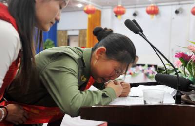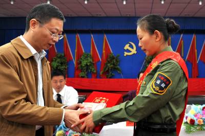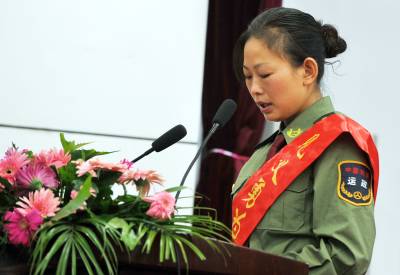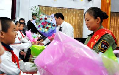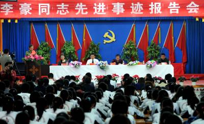 少先队员正在为见义勇为事迹报告团成员之一——伍宗娥献花。2010年10月12日上午,湖北省南漳县在该县城区举行李豪先进事迹报告会。来自全县各条战线的代表们被见义勇为优秀青年李豪和妻子伍宗娥的事迹所感动。报告会上,襄樊市文明委授予李豪、伍宗娥”道德模范特别奖”光荣称号。9月25日10时54分,南漳18路公交车行至水镜路3号站台停车上客时,司机李豪和妻子伍宗娥发现3名惯偷故意挤车,伺机行窃。为了乘客利益不受侵害,在关键时刻,伍宗娥站出来几次大声警告:”莫到这儿搞!”并以此提醒站台和车上的乘客。3名惯偷见”好事”被搅,便与李豪夫妇发生争吵。李豪在下车制止的过程中,被犯罪嫌疑人刘平连刺两刀,经抢救无效身亡。
