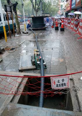 黄石安装地下电缆12日,黄石市武汉路2.02千米架空线入地工程全面启动,犹如蜘蛛网般纵横交错在城市人行道树间的架空线将全部消失。届时,线路悬空带来的”视觉污染”和安全隐患问题将彻底得到解决。图一:黄石城市上空人行道树间的电线”蜘蛛网”。图二:供电公司员工在拉地下电缆。图三:首条电缆缓缓放入地下。黄石市黄石日报摄影部邱孝威摄