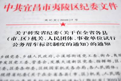 2010年10月份起,湖北省宜昌市各县市区机关、人民团体、事业单位所有公务车辆试行”公务车”标识制度,统一张贴”公务车”标识,公、检、法、司等单位已喷涂明显标识的执法车辆不张贴,报所在县市区纪委监察局审核备案。宜昌市纪委监察局同时公布12388和0717-6252735两个举报电话,受理广大干部群众对违反公车标识和公车管理使用规定的监督举报,对违反有关规定的行为,将按有关规定严肃处理。本报视界网张国荣摄