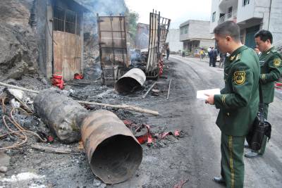 11日下午,一辆牌号为陕E56492的载有鞭炮引线、高氯酸钾、鞭炮包装纸和玻璃胶等易燃易爆品的大货车,在行驶至316国道郧县胡家营镇木瓜沟段时,突然起火并发生爆炸,事故造成车上3人、路上行驶的2名摩托车手、路边2群众共7人不同程度被烧伤,附近二三十米处的居民楼也因爆炸受损。经湖北、陕西两省公安、消防协同作战,火势被迅速扑灭,受伤人员也相继被送到陕西白河县人民医院救治。11日15时50分许,一辆陕西籍后八轮平头大货车正行驶在316国道1719+99米路段,当货车正要拐过一个小弯时,突然从车厢内冒出阵阵浓烟,紧接着火苗就升了上来,瞬间一声巨大的爆炸声从车厢内发出,一团团的火球随着爆炸呈辐射状向四面八方喷涌而出,炙热的火苗和滚滚的浓烟瞬间从车内轰然而上,车的四周被包围在了火海之中。此时,在货车驾驶室内,两名换班司机纪某、党某和押货人员王某发现火苗伸进了驾驶室,巨大的热浪已将车头包裹,幸好三人赶在爆炸前慌忙从车内跑出,但身上多处已经被烧伤。正从车旁经过的两辆摩托车也未能幸免,其中一辆距离货车稍近的摩托车被气浪推开,车手倒地后被喷溅的火种烧伤,另一名距离货车有10来米远的车手也被烧伤,高温下他们已经顾不上摩托车,快速跑到了安全地带。就连远离大货车约三四十米远处,一对在家门口休息的年轻母亲和她2岁的女儿也被飞溅的燃烧物烫伤。16时25分,十堰市110指挥中心才接到现场市民的报警,了解清楚现场情况后,指挥中心迅速将警情下达给市消防支队,按照就近灭火救援的原则,消防支队很快命令东岳消防大队花果中队两台消防车奔赴现场,并向郧县消防大队发出驰援命令。与此同时,考虑到灭火要求十分迫切,事发地点与辖区消防部队距离遥远,市消防支队又立即与距离起火地点最近的陕西白河县消防大队取得联系,请求兄弟部队到场实施灭火救援。由于事发路段正在修路,为保持道路畅通,胡家营派出所和鲍峡交警中队民警赶往现场疏通交通。陕西省白河县交警大队的民警们也闻讯赶往事故现场,为消防车疏通道路,并与当地群众一道将货车上的3名烧伤人员很快被安排到距离事发地最近的白河县人民医院抢救,另外几名烧伤市民也被就近送往当地卫生院治疗,当地政府闻讯后也就地对受灾村民展开救助。16时50分许,白河县消防大队组织了两辆消防车赶到现场,此时出事货车仍被一片火海包围,距离三四十米都能感到滚滚热浪,消防人员冒着不断地零星爆炸和高温靠近火场,用水枪对起火货车实施不间断灭火。约半小时后,现场火势被控制,消防人员又将火场余烬翻开降温,确保险情得到化解后返回。此时,由于沿线道路改造被阻隔,花果消防中队消防官兵在确认现场险情已得到排除后原路返回。火灾被扑灭后,现场已是一片狼籍,距离起火货车最近的是路边一栋4层高的小楼房,爆炸产生的气浪将4层楼的外墙窗户玻璃全部震碎,连铝合金框架也扭曲变形。飞溅的火种蹦进了室内,二楼一间卧室的窗帘、床垫瞬间起火,附近的几户村民家中的玻璃也相继被震碎。同时,货车上飞溅出来的苗在山坡上、路面上、毗邻的一家水泥砖场内燃烧,吓得附近群众不敢回家。时隔5个小时仍然余温未尽险情发生后,郧县县委、县政府十分重视,县委书记柳长毅、政法委书记、公安局长张龙要求各部门要尽快调查事故原因,妥善安抚受伤村民。县公安局副局长陈仁祥带领县消防大队教导员杨建华等赶往现场安排善后和火场调查,当地安监、交通等部门领导也先后到场。由于316国道鲍峡至胡家营路段路面改造实施半幅限行,他们于当日21时许抵达事故现场后,顾不上吃饭休息就和派出所民警、交警一起连夜展开事故调查。此时的事故现场,仍可见缕缕浓烟从路边腾起,零星火种还在燃烧,现场到处都是刺鼻的烧焦味,路面上留下厚厚的一层黑渍,还隐约能听到火烧的噼啪响声。路边一辆大货车烧得只剩下外壳,车头已经完全辨认不出颜色,车厢上还有未烧尽的红色包装纸缓缓地冒着浓烟。距离车身十多米远处,变形的货车车厢挡板被气浪冲到了一边。在距离大货车车身后方约10多米处,两辆摩托车已经烧得只剩下空壳,旁边的一栋4层居民楼大门紧锁,可外墙玻璃已经全部脱落,瓷砖外墙上也斑斑点点布满了火烧后的黑色污渍,房前路边扔着一张烧废弃的席梦思床垫。在不远处的水泥砖厂里,水泥砖上尽是喷溅后燃烧的污渍,砖厂的一间简易棚子也被烧着,路边山上的草木全被烤焦。”车上的货物一爆炸,喷出的东西粘在哪儿,哪就开始燃烧。”一位目击现场的村民在谈到事发时还心有余悸,他介绍,事发时飞溅出来的东西有四五十米远,老远都能感受到滚滚热浪,大火整整烧了两个小时直到被扑灭。事后,据离爆炸现场最近受损房屋屋主李某介绍,当时货车起火后先后发生了三次爆炸,飞溅的火星将房屋点燃后,她吓得从一楼后窗跳到汉江河道上,才转移到安全地段。事故原因已初步查明事故发生后,郧县公安、消防、安监部门组成联合调查组,胡家营镇政府也组织相关人员对受损房屋进行勘察评估。经过调查人员询问当事人、目击者,走访群众和现场查看,初步了解到出事货车是从陕西渭南货车,10日在湖南遇到陕西旬阳鞭炮厂的王某后,达成协议有一批鞭炮半成品运到旬阳,但车主两人具体也不知道运什么东西,装货完毕后于10日晚从浏阳返