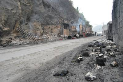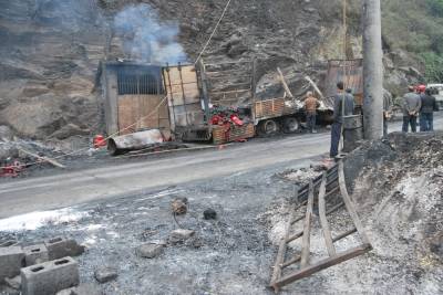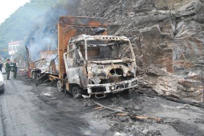 图文:鄂陕边界两地警民大营救11日下午5时50分许,一辆载有鞭炮引线、包装纸和玻璃胶等易燃易爆品的车牌号为陕E564××后八轮平头大货车,行至鄂陕交界的316国道郧县胡家营镇1719+99米路段,正要拐过一个小弯,突然从车厢内冒出阵阵浓烟,紧接着火苗就蹿了起来。随后,车厢内传出一声巨大的爆炸声,一团团火球随着爆炸呈辐射状向四面八方喷涌而出,车的四周成为火海。造成车上3人、路上2名摩托车手、路边2人不同程度烧伤,附近一栋居民楼也起火受损。事发后,十堰市110指挥中心迅速将警情下达给该市消防支队,按照就近灭火救援的原则,消防支队很快命令东岳消防大队花果中队两台消防车奔赴现场,并向郧县消防大队发出驰援命令。与此同时,考虑到事发地点与辖区消防部队距离遥远,该市消防支队又与距离起火地点最近的陕西白河县消防大队取得联系,请求兄弟部队到场救援。16时50分许,白河县消防大队组织两辆消防车赶到现场。此时出事货车仍被大火包围,并不断发生零星爆炸,消防员不顾危险对起火货车实施不间断灭火。约半小时后,现场火势得到控制,消防员又将火场余烬翻开降温,确保险情得到化解后撤离。险情发生后,郧县公安局副局长陈仁祥带领县消防大队教导员杨建华等赶往现场安排善后和火场调查,当地安监、交通等部门领导也先后到场。事故调查人员初步了解发现,出事货车是从陕西运输货物去湖南浏阳,10日晚又从浏阳返回陕西渭南,上面装有300箱鞭炮引线、6桶玻璃胶和一批鞭炮包装纸等货物,在行驶途中发生了爆燃事故。目前,调查人员又在现场发现车载货物中有一批易爆品高氯酸钾,这也是引起货车爆燃的诱因。目前,事故中受伤的货车司机党某伤势最重,全身95%面积烧伤,情况仍十分危险;另一名司机纪某面部、四肢等部位也烧伤严重,两人已被转往西安接受治疗。另几名伤者伤势相对较轻,经过治疗已无生命危险。据调查人员初步认定,货车爆燃原因是车上的易燃品在运输途中因长期颠簸摩擦生热积聚热量后引起。目前,郧县公安、消防部门正对事故原因和损失情况进行深入调查,善后工作也在积极进行中。(本报视界网徐雁初李镇海摄)