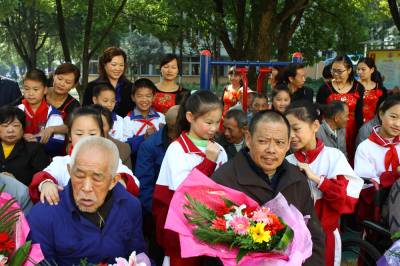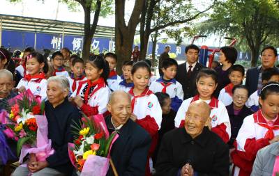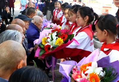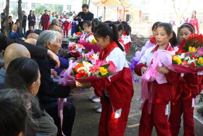 (重阳节前夕)15日上午,京山县京山小学的40多名小学生在老师的带领下带着鲜花和礼物,来到京山县社会福利院看望老人们,还为老人献上他们精心准备的文艺节目,博得了老人们阵阵喝彩和热烈掌声,为他们送去节日的祝福。通讯员李凯晏守军摄