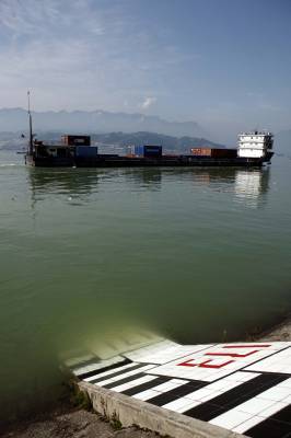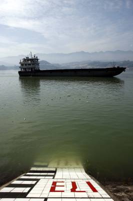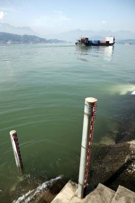 三峡工程175米蓄水进入冲刺阶段2010年10月15日拍摄,轮船在三峡库区左岸航道上行。当天下午14时三峡水库水位达到172.37米,接近和超过2008年,因考虑坝区上游地质灾害等问题,蓄水止于172.8米;2009年则又因下游需要增加补水,水位止于171.43米。这标志着175米蓄水进入”5米冲刺阶段阶段。由于近期降雨,长江上游入库流量为15600立方米/秒,三峡出库流量9820立方米/秒,为今年的蓄水创造极有利条件。文振效