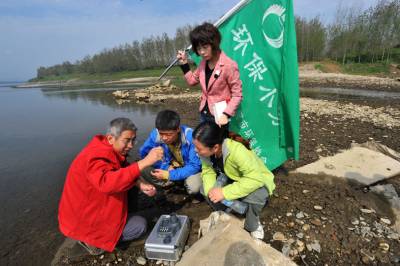 10月14日,”绿色汉江”环保志愿者第三小分队的志愿者在樊城太平店检测汉江水质。当天,”绿色汉江”环保志愿者第三小分队从汉江崔家营赶至丹江大坝,行程250多公里检测多断面的水质。