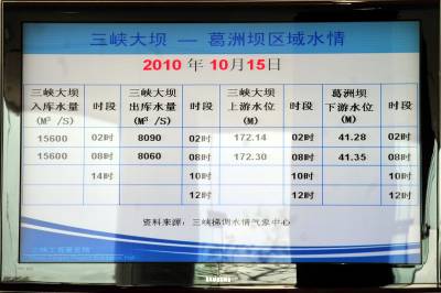 截至2010年10月15日8时,三峡坝前水位达到172.30米,已超过2009年175米蓄水的171.43米。目前,三峡工程175米试验性蓄水已进入最后冲刺阶段,10月底前将蓄水至175米。 长江海事部门提醒驾引人员对三峡库区175米蓄水、葛洲坝下泄流量减少、枝江水位陡降,加之恶劣天气大雾频发等情况应高度重视,慎谨驾驶。同时提醒超水吃船舶主动申请减载,经海事部门认可后方能通过中游,确保长江中游安全畅通。本报视界网张国荣摄