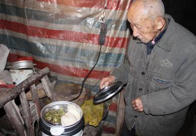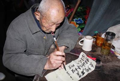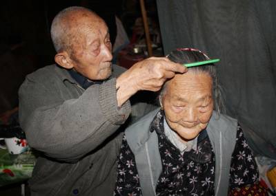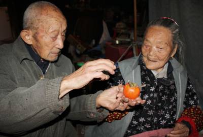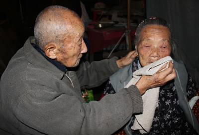 在孝昌县陡山乡七星村,有一对远近闻名的百岁夫妻,丈夫陈圣涛101岁,妻子徐小英102岁,这对”双百夫妻”于1928年结婚,相濡以沫地生活了整整82年。据了解,这对老夫妇是孝昌目前婚龄最长的健在夫妇。陈圣涛说,他和婆婆都喜欢锻炼身体,夏天早上4点起床,冬天早晨5点钟起床。80多岁时每天绕着村子转四、五圈;现在年纪大了,体力比以前差,且婆婆2008年9月锻炼时摔伤,现在只有拄着拐杖,在爹爹的搀扶下,慢慢地绕村子步行一个圈。徐婆婆和陈爹爹共育11个子女,3个儿子,8个女儿。平时照看两位老人的是其50多岁的外甥女婿段松清。两位老人除了有些耳背、婆婆牙齿脱落外,身体没什么大碍。陈圣涛爹爹除照顾婆婆和在后院种点蔬菜外,还经常在家写毛笔字;徐小英婆婆眼神不错,到现在还能穿针引线为陈爹爹缝补衣服。怕笔者不相信,陈爹爹从房间拿出笔墨,在一张纸上写了”共产党万岁,陈圣涛今年101岁,陈徐氏~102岁”三行大字外,还在旁边用小字写了”中华人民共和国”。老人的外甥女婿段松清说,外公和外婆喜欢吃的是粗茶淡饭,除喜欢喝排骨汤外,很少吃肉。平常给外婆做饭、洗脸等事情,都坚持自己干,不让儿女和他插手;外公在人民公社时期还当过十七年的生产队长,特别乐于助人,每年村子里许多农户家的对联,都是出自他的手笔。宋俊初摄