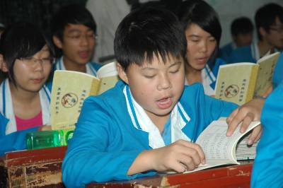 10月14日下午,钟祥四中2000余名学生手捧社会热心人士赠送的《弟子规》大声朗读,体会理解经典传统文化的内涵,接受道德教育。