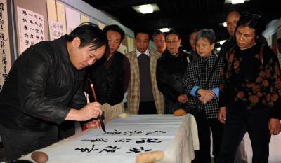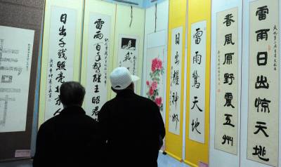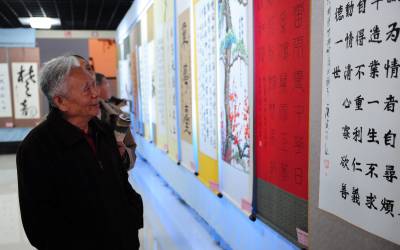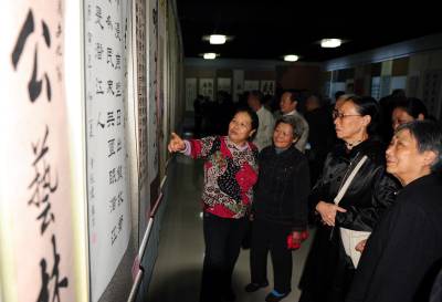潜江重阳颂曹禺10月16日,潜江市老年朋友们在一起欣赏”纪念曹禺诞辰一百周年暨重阳节老年书画展”。湖北省潜江市老年书画研究会的老年朋友以曹禺的剧作、诗词为内容,创作80余幅精美的书画作品展出,表达对大师曹禺的缅怀和景仰。吴燕军摄