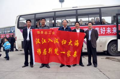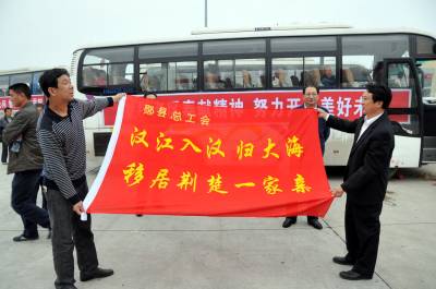 10月18日上午8:33分,湖北省郧县柳陂镇垭子村276户1110人的外迁移民乘座63辆客车和46辆货车搬迁至武汉市汉南区东荆衍,在高速公路第二站随州服务区休息时,11组外迁移民李荣书找到郧县送移民的县领导要求将一面锦旗转交给县总工会,以表示对总工会工作队队员们的感谢,县委常委,县政法委书记,县移民指挥部常务副指挥长周吉礼代表县总工会接过了锦旗,县长胡玖明,县人大副主任马德学,柳陂镇镇长秦子胤与李荣书一起合影,锦旗上书:郧县总工会”汉江入汉归大海,移居荆楚一家亲”。自国家实施南水北倜中线工程以来,郧县做为核心水源区将有30264人将外迁,为做好外迁移民工作2009年9月县直工作队深入包保对象村组开展工作,郧县总工会移民工作队负责柳陂镇垭子村10.11组14户60人的外迁工作,在一年多的工作中12各工作队员与移民们结下了深厚的友谊,于是出现了外迁途中赠锦旗的感人一幕。图1为郧县总工会主席尹长胜(右2)与工作队员一起与11组80岁外迁移民李金海(中)81岁的妻子陈良华(左3)合影留念时的情景。图2为县委常委,县政法委书记,县移民指挥部常务副指挥长周吉礼(右)代表县总工会从李荣书手中接过了锦旗时的情景。图3为县长胡玖明(中)县政法委书记周吉礼(右2),县人大副主任马德学(右1),柳陂镇镇长秦子胤(左1)与李荣书(左2)一起合影时的情景。周家山杨文华赵锋摄湖北省郧县城管大队电话13872840078邮编442500