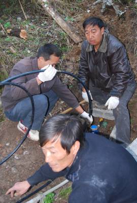 10月19日,巴东县绿葱坡镇袁家荒村农民正在安装饮水管道。今年,巴东县实施95个村的”饮水安全”工程,总投资1200万元,共有33717人受益。田植峰杨家能摄