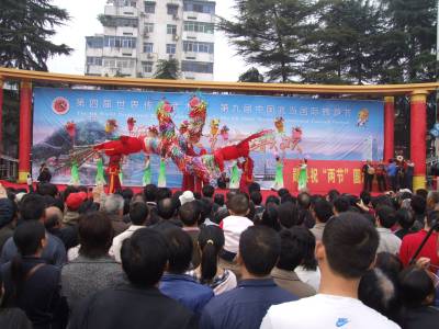 10月19日,是第四届世界传统武术节,第九届中国武当国际旅游节在湖北省十堰市举办第三天,也是十堰市群众文艺大联欢的第三天。郧县组织郧阳传统花灯,凤凰花灯,双龙戏珠,白鹤戏蚌,摔跤,虾,猪八戒背媳妇,推粮车等节目在十堰广场演出,受到观众和外国友人的欢迎。图1为郧阳传统凤凰花灯正在台上演出时的情景。图2为观众正在观看花灯节目白鹤戏蚌时的情景。周家山摄湖北省郧县城管大队电话13872840078邮编442500