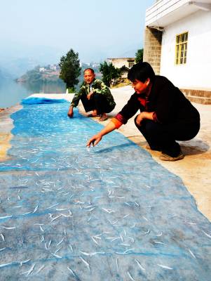 巴东库区农民家门口挣”副业”(图)19日,巴东县官渡口镇红花岭村一组农民万昌林、王联敏夫妇正在晾晒银鱼。据了解,自三峡库区蓄水后,江里的鱼类有了更大的生存空间,而居住在两岸的移民只要在家门口放上一个网,一夜的功夫就能捞上银鱼好几公斤,然后晾干,按市场价60元每公斤计算,户平年增收3000至4000元。(本报视界网梁勇摄)
