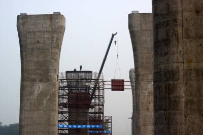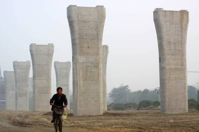 2010年10月19日,湖北襄樊,一名工人从林立的汉江三桥桥墩下经过。正在建设中的汉江三桥共有172个桥墩,目前已经建成近三分之一,大桥巍峨身影初现。