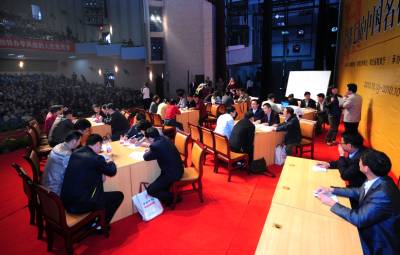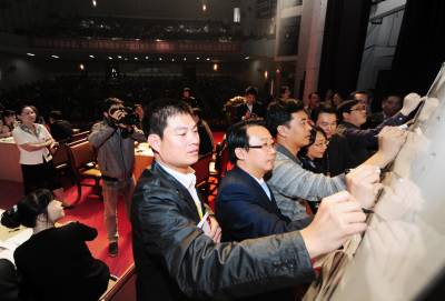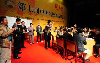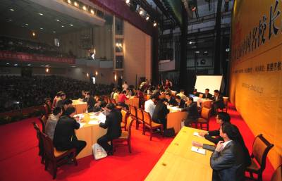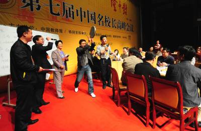 10月20日,在第七届全国名校长高峰会议现场,36名校长自愿报名走上主席台,参加会议的”体验式论坛”环节,他们以学生的身份,小组讨论,想口号,做组徽,表演节目,亲身演绎高效课堂构建全过程。谢勇摄