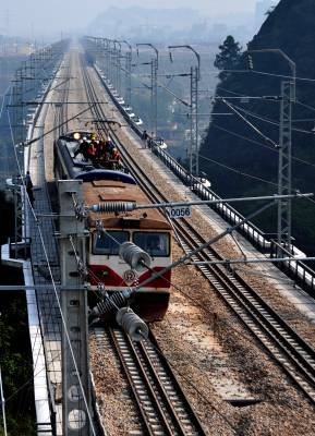 10月21日,工程技术人员在宜万铁路恩施至重庆万州段用电气化专用检测车进行冷滑试验。从10月20日开始,中铁电气化局的工程技术人员开始在宜万铁路上对电气化接触网进行冷滑试验,标志着宜万铁路全面进入不带电冷滑试验阶段,为随后进行的热滑试验和动车模拟运行创造了条件。宜万铁路全长377公里,东起宜昌市,西至重庆万州区。视界网杨顺丕汪文富摄