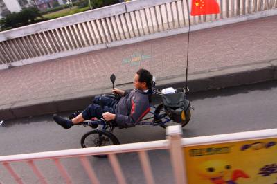 2010年10月23日,湖北襄樊,一名市民半坐半卧在一辆特殊形状的自行车上行进。这辆卧式自行车有三个轮子,重心较普通自行车要低,因此其行驶速度相对较快。但不知这种改装自行车是否符合有关道路交通规则。
