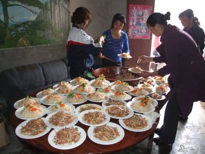 10月24日中午,湖北省郧县柳陂镇挖断岗村5组热闹非凡,该组350多人在大院汇集一堂35桌酒席共同举杯为朱氏家族40户165人外迁他乡送行祝福,这是继10月23日该镇兰家岗村1组朱氏四兄弟为65户183人朱家亲戚摆26席家宴送行的又一次盛宴,挖断岗村5组盛宴由该组朱氏五兄弟操办,特别是己成为湖北楚雄工贸公司总经理的朱成芳为此次盛宴出资出力,致富不忘响应支持国家南水北调中线工程。郧县是国家南水北调中线工程核心水源区,有30264人将外迁他乡,柳陂镇又是郧县移民外迁大镇,有10000多人需要外迁,而挖断岗村5组紧靠车城十堰市,村民们以种菜致富。加之朱氏家族祖先朱玉泗在500多年前告别故居江西南昌县崩土慷朱巷,陪长子朱玑赴任郧阳府儒学训导兼正堂主事。朱氏郧阳先祖沿汉江南岸进鹰卧沟,过黄坪越沙州,走观沟,落后槽,拓荒种地。仅柳陂镇兰家岗村和挖断岗村朱氏后人己在此经历了320年16代人。在南水北调中线工程柳陂镇挖断岗村和兰家岗村即将外迁之际朱氏兄弟在两村先后倡议发起了”欢送朱氏家族及家乡亲人远离故土重建家园心连心茶话会”和兰家岗村1组的”郧阳柳陂后槽居民支持南水北调茶话会”。在茶话会上各组组长,长辈,宗亲代表,以及宗亲文化研究会会长,湖北楚雄工贸公司总经理朱成芳分别讲话致词,祝众移民乡亲在新的家园幸福安康,不忘郧阳老家并照了家族赴宴的集体合影。精彩的文艺演出让掌声不断,自家合影纪念照一拨接着一拨,刻光蝶的摄像机记录全过程。图1为挖断岗村5组300多人的朱氏家族合影时的情景。图2为每户户主代表在红纸上签名留念时的情景。图3为10月23日兰家岗村1组茶话会上朱天英演唱的歌曲《打个电话》让许多乡亲流下了眼泪。图4为厨房里正在精心准备可口的酒菜时的情景。图5为歌手何雪蚕正在挖断岗村演唱《父亲》时的情景。图6为演员们正在兰家岗村1组表演大秧歌时的情景。图7为兰家岗村1组外迁移民举杯同饮告别酒时的情景。图8为挖断岗村5组全村人的告别盛宴时的场景。周家山杨文华摄湖北省郧县城管大队电话13872840078邮编442500