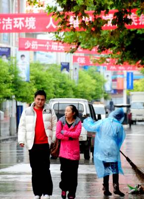 26日,宣恩县一对情侣走在寒风中。25日起,受今年入秋以来最强的强冷空气影响,湖北省大部地区气温骤降,最高降幅达10℃以上,并伴有4到5级北风和小雨,市民们纷纷围起围巾,穿起毛衫御寒。据气象部门预计,此次降温过程还将持续2天左右。