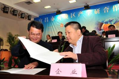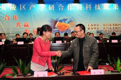 2010年10月26日,湖北省宜昌市夷陵区举办产学研合作暨科技成果发布会,武汉大学、华中农业大学、华中科技大学等高校现场发布了最新科技成果,宜昌市夷陵区10多家企业与16家高校和科研单位签订了机电、化工、医药、食品等16项产学研合作协议。 长期以来,宜昌市夷陵区100多家企业加强与高校和科研单位的产学研合作,累计投入科研经费3.1亿元,形成了柑橘、茶叶、畜牧三大农业支柱产业和食品饮料、机械电子、化工医药、新型建材、包装纺织五大工业板块,农产品加工企业达到53家、产值106亿元,规模工业企业达到178家、产值207亿元。本报视界网张国荣摄