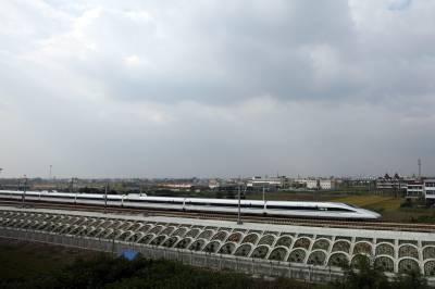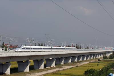26日,一列动车飞驰在沪杭高铁上。当天世界运营时速最高的高铁——沪(上海)杭(州)高铁通车运营。开通后,从上海虹桥到杭州最快只需45分钟。