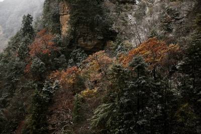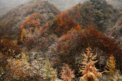 10月26日,神农架海拔1500米的高山地带普降小雪,在秋色正浓的神农架燕天景区,五色斑斓的植被,洒满冰雪装点的银色,宛若国画。
