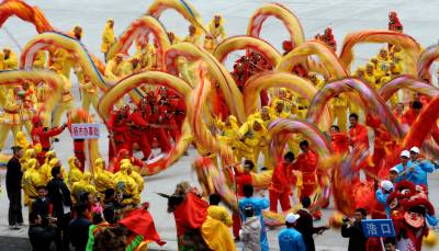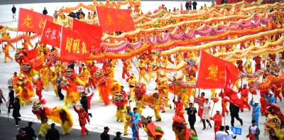 27日上午,潜江市体育场内锣鼓喧天,来自全市的25个龙狮代表队在此进行该市规模最大的舞龙狮大比赛活动,表达该市百姓对丰收十月的祝贺,同时也把第二届中国(潜江)曹禺文化周推向了又一高潮。记者郑元昌摄。