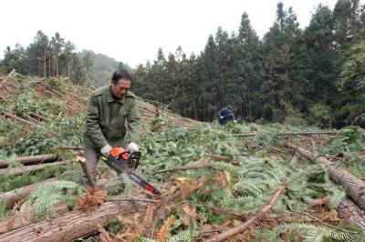 由于京山县森林资源得到充分保护,木材蓄积量得到可持续性的开发,”绿色银行”为村集体和村民带来了实惠和收入。图为10月27日,杨集镇芦棚村村民正在对集体所有的杉树林间伐。(张文胜摄)