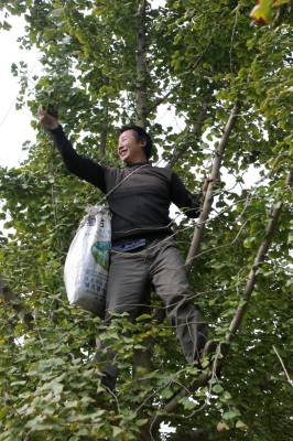 金秋季节,又到了采摘银杏叶的日子。京山县多年开发种植的银杏树普遍进入了丰产期。当地农民根据市场需求,除了采摘银杏果以外,还及时采摘银杏叶,使以前自然枯落的叶子也卖出了一元的高价,成为农民又一增收的新路子。(张文胜摄)