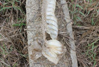10月月29日下午,孝昌凤凰山公墓的草丛中惊现一条4近米长的大蛇,见人来也不惊慌,慢悠悠地从院墙下的孔洞中爬了出去。15点20分许,笔者赶到位于该县陡山乡境内的凤凰山公墓。该公墓工作人员黄金翠告诉笔者,40分钟前,她带领5名民工在清理公墓东坡上的杂草时,突然惊奇地发现前方草丛中有一大团”牛粪”。公墓中没有牛怎么会有牛粪呢,再说也没有见过这么大团的牛粪。黄金翠和一名许性男民工刚奇怪地朝牛粪方向走了几步,突然看见”牛粪”中伸出个蛇头,吓的”妈呀”一声撒腿就跑开了。其余几名男民工赶紧拿着铁锹、棍棒等物跑了过来,慢慢向那条大蛇靠近。可这条近4米长的大蛇根本就没有害怕的意思,不紧不慢地伸直身子后,蜿蜒着爬向院墙东边,从墙下的孔洞中钻了出去,消失在丛林中。随后,黄金翠和民工在东坡的草丛中仔细寻找,居然在发现大蛇20多米远的草丛中,找到了一条2.1米长的蛇蜕。林业部门相关技术人员告诉笔者,蛇每成长一个周期就要蜕一次皮,但蛇蜕和发现的大蛇长度相隔太远,所以蛇蜕和发现的大蛇应该不是一条。由于公墓四周是山林和水库,环境幽静,且经常有人带水果和食物前来这里祭祀,吸引了不少的老鼠,而老鼠正是蛇类的美食,因此这里有大蛇出没就显得十分正常了。宋俊初摄