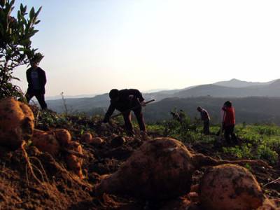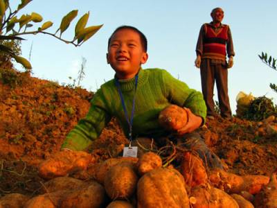 10月29日下午,郧县安阳镇种植大户赵随章请了农民工挖红薯,一名小学生也高兴地前来”帮忙”。因遭受洪涝灾害,郧县今年大多农作物严重减产,而赵随章与青山镇老板龚士华签单在柑橘幼园里间种的20亩脱毒七彩红薯却喜获丰收,亩产竟达3000多公斤,比种植普通红薯每亩要增收500多元钱。