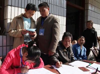 竹山县人口普查工作全面启动11月1日,人口普查员汪启兵(中),在竹山县双台乡元坪村指导入户登记填表(如图),为全面、准确、客观、真实地完成第六次人口普查工作,竹山263名普查指导员和1400多名普查登记员,将进村入户,尽职尽责,开展工作,确保人口普查工作园满完成。操春林摄竹山县林业局(442200)
