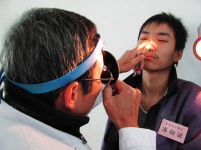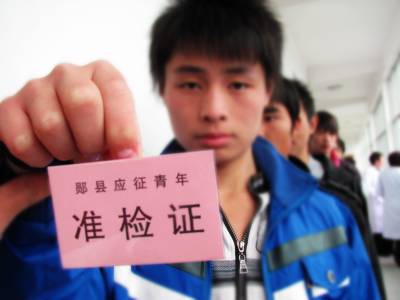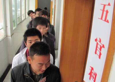 11月1日上午,郧县适龄应征青年在该县民兵训练基地五官科接受检查。当日,全国冬季征兵体检工作全面展开,各地适龄青年踊跃报名参军。今年的征兵政策仍然坚持把高学历青年征集摆在突出位置,具有高中学历以上文化程度的青年,是今年征兵的主体对象。(十堰市郧县新闻宣传中心曹忠宏摄影报道邮编442500电话13294212877)