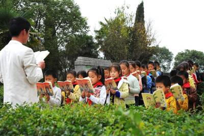 深入开展创先争优活动,湖北省鄂州市华容区蒲团乡上倪小学为了进一步规范办学行为、构建和谐校园,把中国传统文化《弟子规》作为该校德育教学的蓝本,以精练的语言对学生进行早期启蒙教育,灌输儒家文化的精髓。图为该校教师带领学生学习《弟子规》。