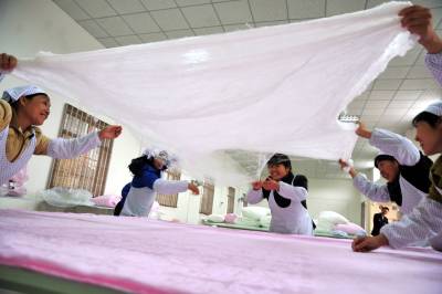 2010年10月底,在位于三峡坝区——湖北省宜昌市夷陵区三斗坪镇中堡村的三峡桑蚕丝绸产业文化园,首家宜昌银罡蚕茧科技有限公司兴上的蚕丝被生产线正式投产,当地30多名三峡移民被该公司第一批录用,走进生产车间开始批量生产。 宜昌市夷陵区有桑园3万多亩,年产蚕茧300多吨。该区建立三峡桑蚕丝绸产业文化园,扶持桑蚕加工企业发展壮大,将构建一条集蚕丝家纺、桑蚕食品、桑蚕观光旅游等多位一体的综合性农业产业链。目前,园区一期工程蚕丝被生产线投产达到年产蚕丝被15000床的生产能力,二期工程明年完工后年生产蚕丝系列产品3万件以上,将达到年创产值5000万元,安置移民就业200人的规模。本报视界网张国荣摄