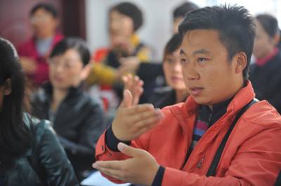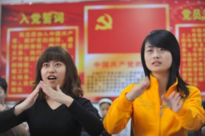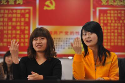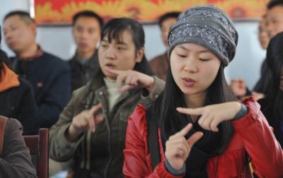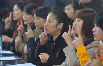 11月5日,襄樊市区商业、医院等服务行业的职工们在学习”中国手语”。当日,20多个单位、49名湖北省襄樊市区商业、医院等服务行业的职工来到襄樊盲聋哑学校,学习”中国手语”,为创建全国无障碍城市学习”爱心语言”。