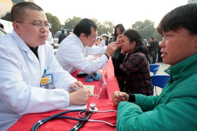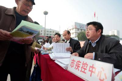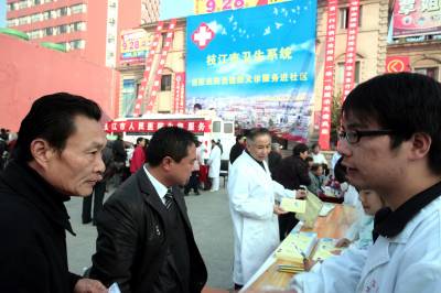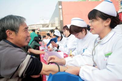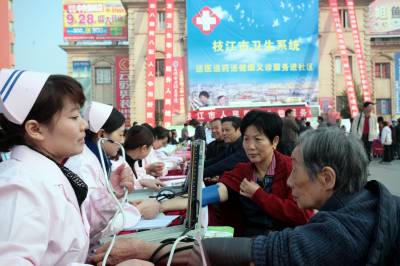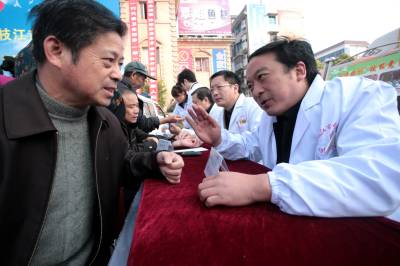 枝江:百名医护人员送医进社区11月5日,枝江市医院医护人员正在义诊。当日,湖北省枝江市卫生系统组织百名医护人员到社区开展了送医、送药、送健康义诊服务活动,2万多名市民接受了诊疗、咨询和健康教育。刘卫东摄