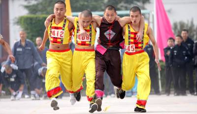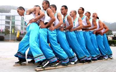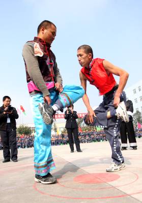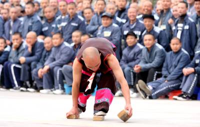 11月5日,湖北省恩施监狱,身穿少数民族服装的服刑人员在进行”摸石头过河”比赛。当日,湖北省恩施监狱举办第四届少数民族运动会,划龙船、斗蛐蛐儿、摸石头过河等民族趣味浓厚的体育项目,受到服刑人员欢迎。据悉,恩施监狱是湖北省唯一一所少数民族地区监狱,运动会已成为该监狱探索由封闭式监管向开放型监管过渡的有益尝试,该监狱已连续4年举办了少数民族运动会,通过运动会这个特殊的交流平台,为探寻”创建具有少数民族特色的现代化文明监狱”找到了”金钥匙”。