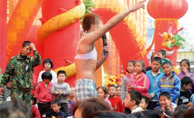 小伙子穿文胸不害羞7日,黄石市某酒店开业请来文艺队表演助兴,为吸引顾客的眼球,一名小伙子竟然穿着女人的文胸在广庭大众下上台表演,在场的小朋友们露出疑惑的目光。市民感慨,现在人为了赚钱,什么文明都不讲了。黄石市黄石日报摄影部邱孝威摄电话:13807232603邮编:435002
