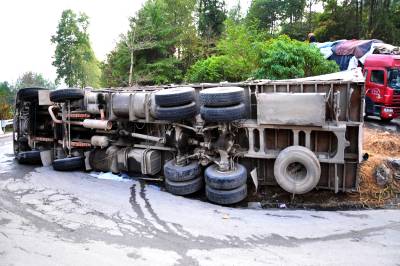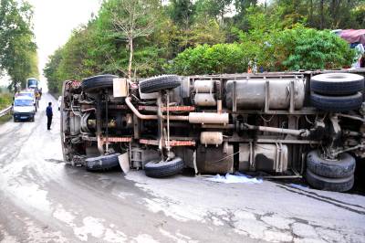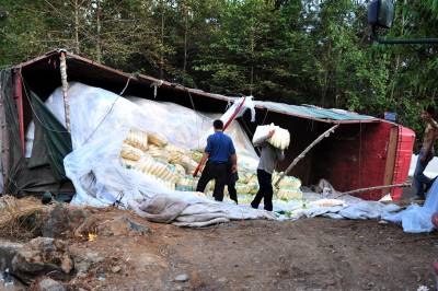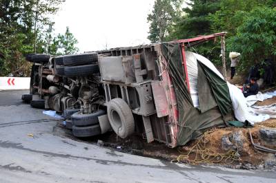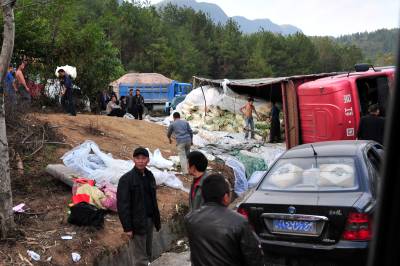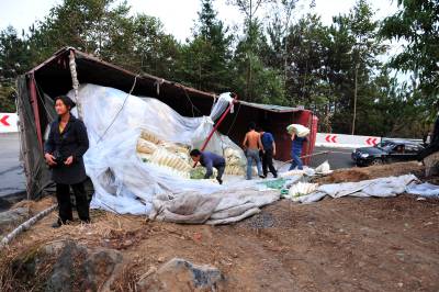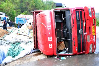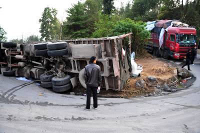 2010年11月6日上午,湖北省恩施土家苗族自治州恩施市屯(堡)渝(重庆奉节)公路屯堡乡境内,一辆大型货车满载一车萝卜在下山的一处拐弯处侧翻,损失惨重,所幸没有造成人员伤亡,由恩施城区通往恩施大峡谷景区的中大型车辆受阻12小时。当地交警部门提醒过往车辆司机,山区公路坡陡湾多,一定要谨慎小心驾驶。本报视界网张国荣摄