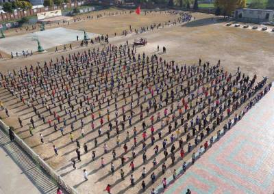 在冬季来临之前,湖北郧县各学校平整、宽阔的操场成为开展冬季体育锻炼的主场地。全县师生利用大课间时间积极参与阳光体育运动,每人每天至少跑完1500米,形成了浓郁的校园体育锻炼氛围。图为该县谭山镇中学学生课间操时间活动的场景。