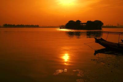 金色夕阳倒映东湖湖面,观之使人陶醉。