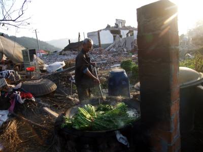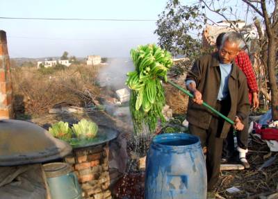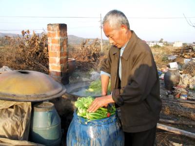 11月9日下午,湖北省郧县柳陂镇兴盛村7组外迁移民龚永学正在己拆除的自家房后烧锅炸酸莱并将炸好的辣菜装大塑料桶里,这一大塑料桶里足足有180斤酸莱,随后还有4家移民排队等侯炸酸莱,郧县郧阳酸莱很受当地人喜爱,兴盛村地处南水北调中线工程淹没线以下,11月12日他们将迁往潜江市广华农场安置地生活,临走许多乡亲将地里的辣菜收回炸成酸菜带到外地,在安置地生活能吃上从家乡带来的酸菜也是一个念想。龚永学说:”南水北调中线工程是国家工程,俺不给国家找麻烦,到那都是样生活,你没看俺的房子早就拆了”。图为龚永学正在将炸好的酸菜装进大塑料桶里时的情景。周家山杨文华摄湖北省郧县城管大队电话13872840078邮编442500