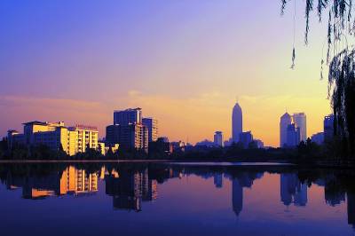 夕阳照耀下的汉口菱角湖公园,远处的西北湖现代高楼群尽收眼底。